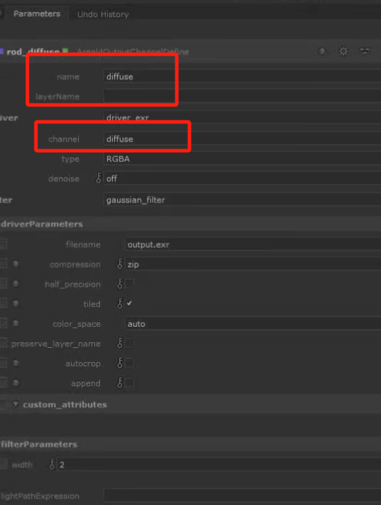 更改对应的命名参数才算完成一个aov通道的输出设置。(注意,每个aov通道输出需要renderoutputchaneldefine节点以及renderoutputdefine节点共同来定义,而在定义aov之前的总源头需要一个renderoutputdefine来定义beauti层输出。)