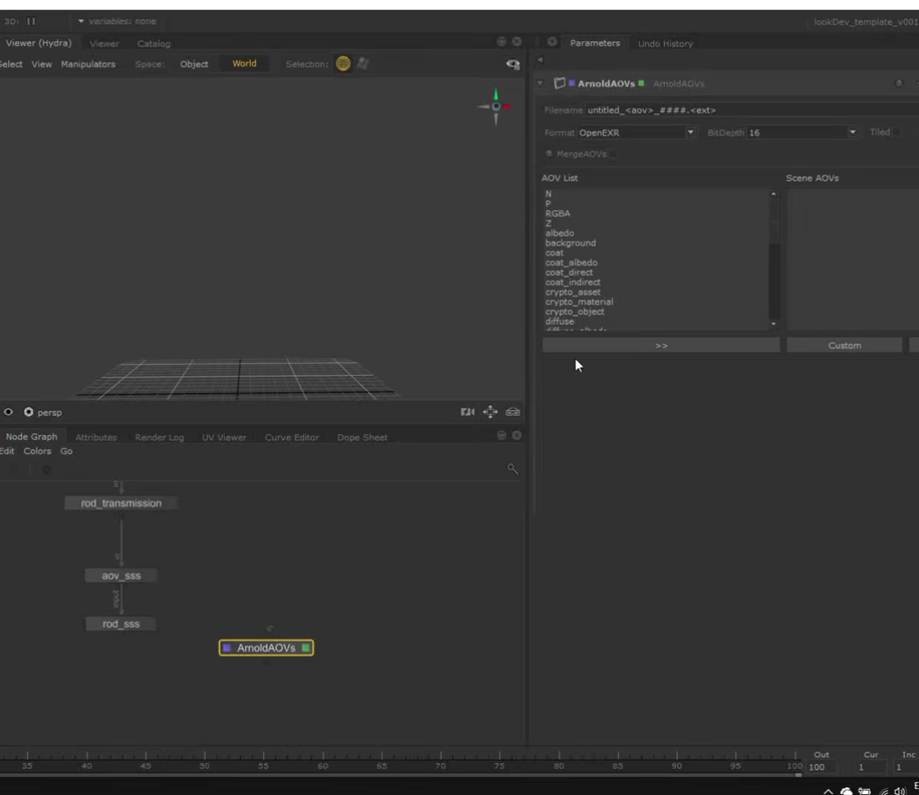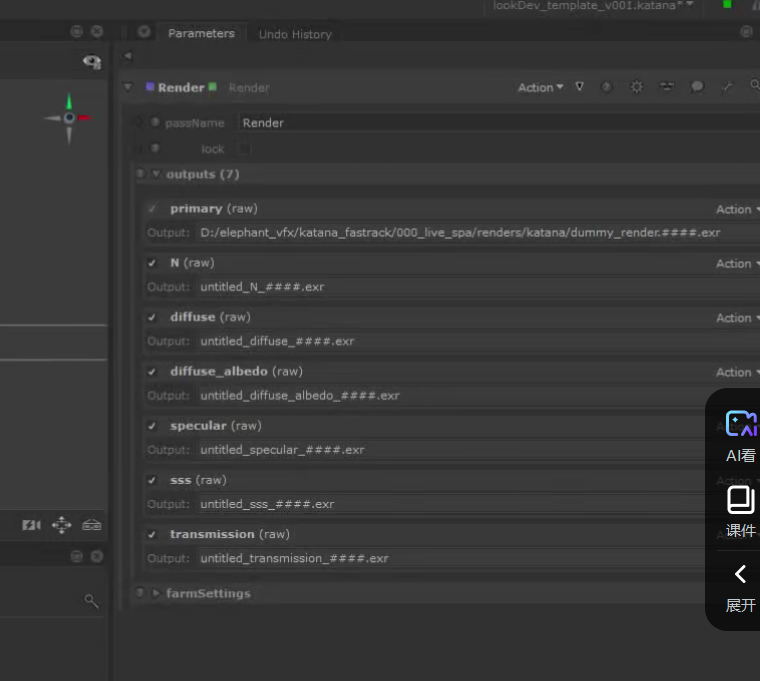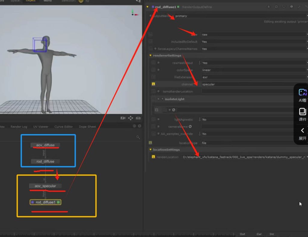 下一步是针对aov渲染输出的节点设置,可以通过renderoutputdefine以及outputchanneldefine节点,以及自定义设置不同渲染器语言的lpe灯光路径通道来组成stack栈来对灯光输出分层做出更多可控性操作,注意,在这节课程中是基本的aov输出操作,更加进阶的操作可以参考别人写的oscript代码插件或者python插件进行自动化输出以及更新命名,定位输出空间格式等操作,以及学习不同渲染器直接不同的aov自动化渲染输出方式。