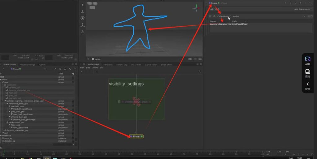 Prune不进会去掉视窗界面的物体显示也同样会影响到最终渲染的可视化,与visibility 节点不同: