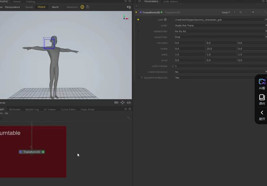 下一步是关于turntable的设置,本质上是针对lookdev中transform 3d节点对于物体与灯光的旋转K帧:
