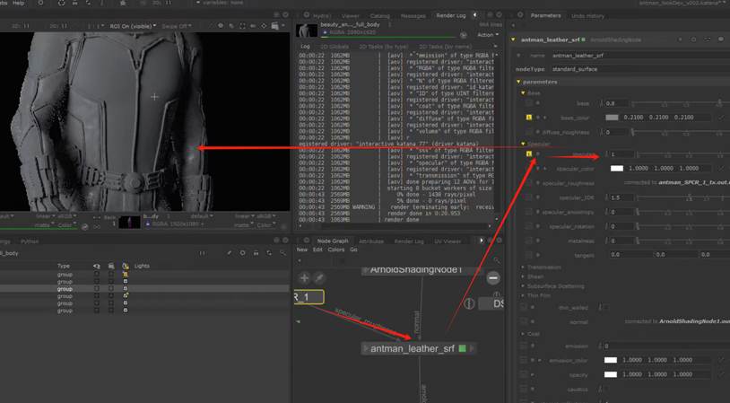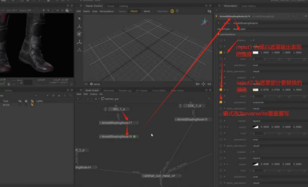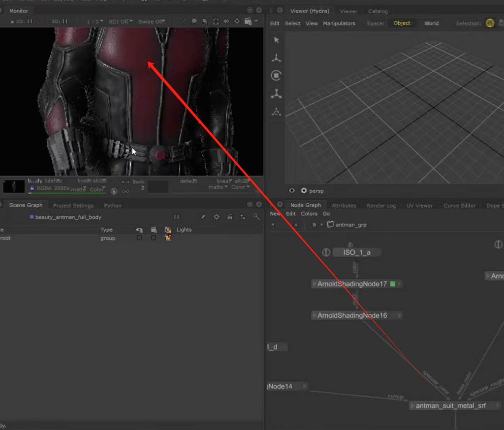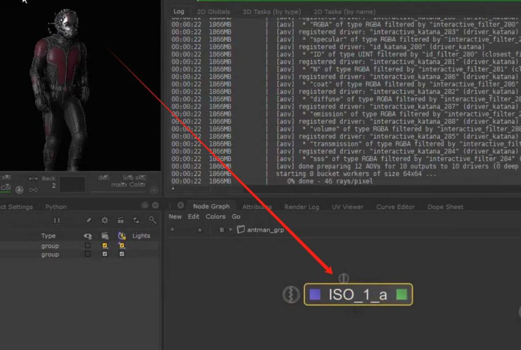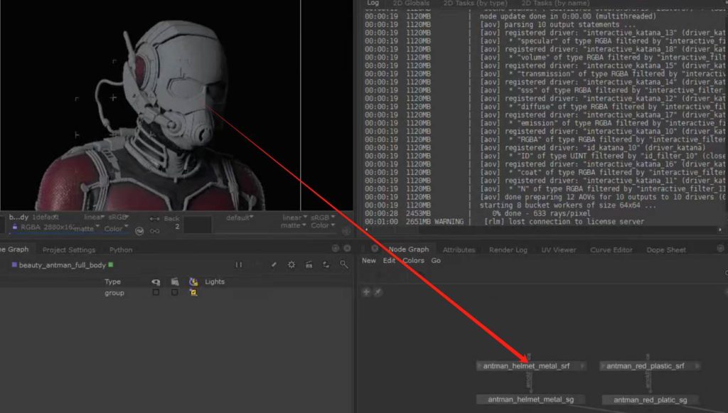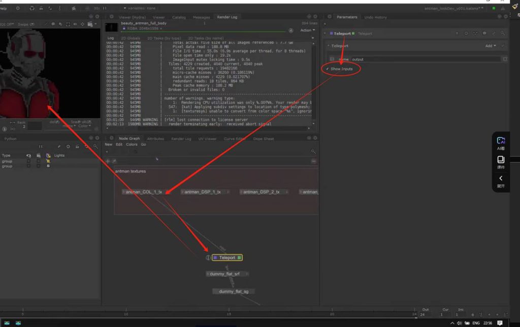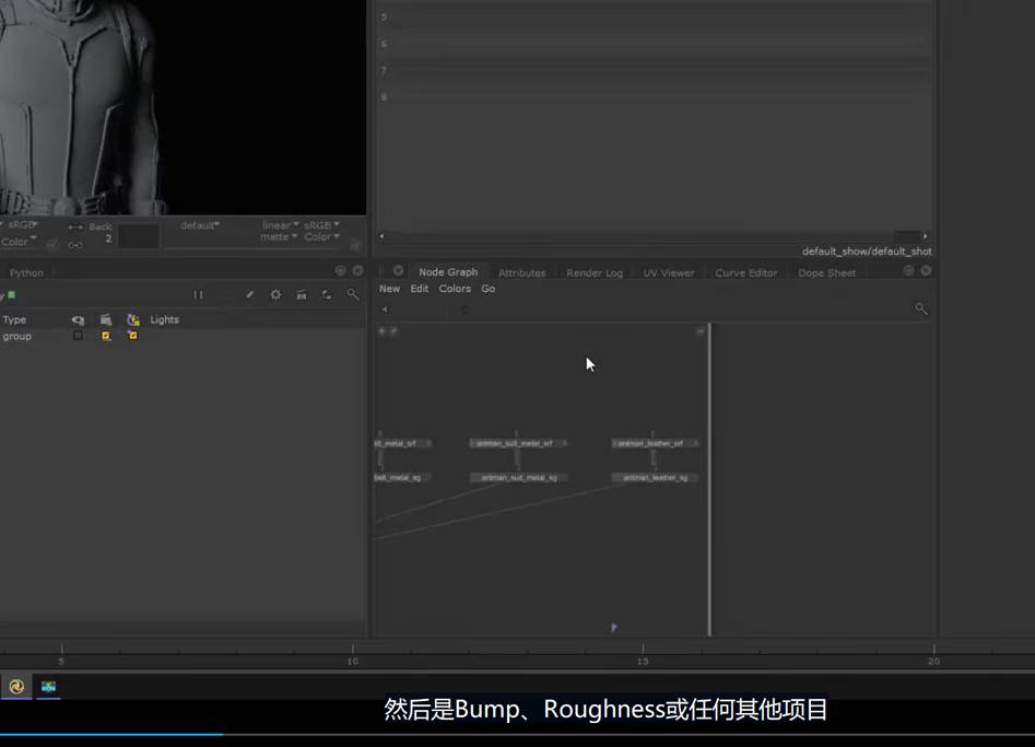 如果想要保持节点连接的整体可观性,可以使用teleport节点进行对节点连接线的隐藏自定义显示,又或者我们可以使用goupstack将不同的材质球节点group打组到一个节点中进行包装(参考KA Renderman 工程文件示例):