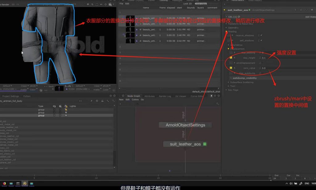 修改手部分的置换问题只需要再增加对应的collection到custom范围即可,对于没有置换属性的部位我们则需要额外再创建新的arnold object setting 加入对于没有置换属性的collection,然后设置置换属性为0即可。