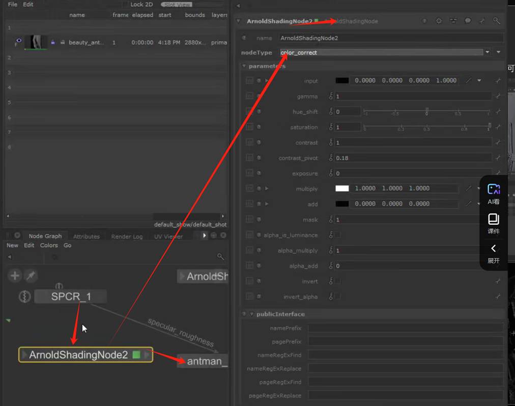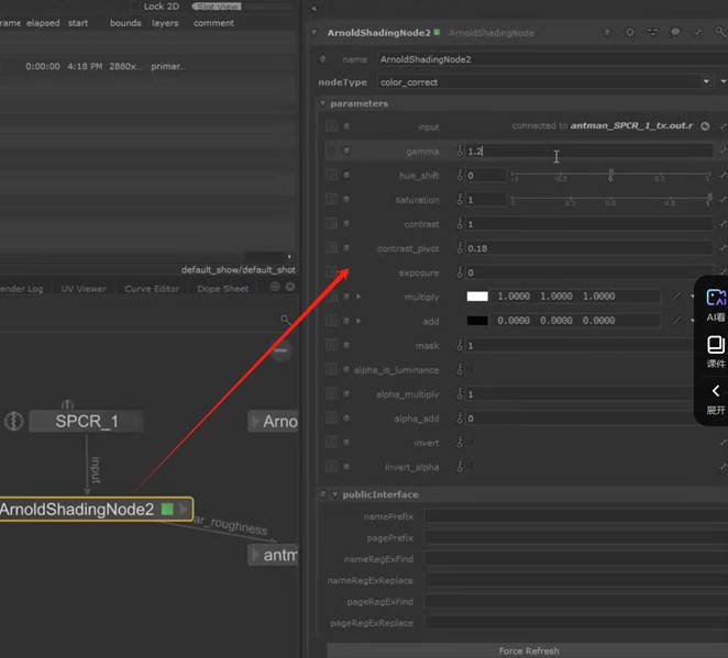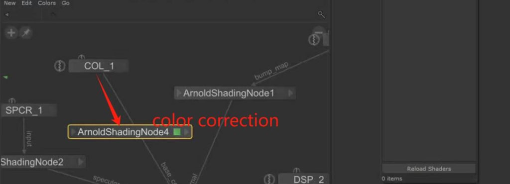利用shading node 更改为color correct模式来连接粗糙度到材质球,可以调节纹理颜色参数: