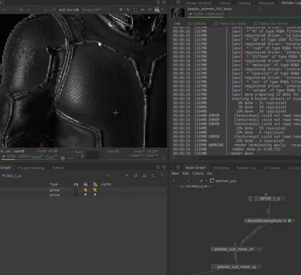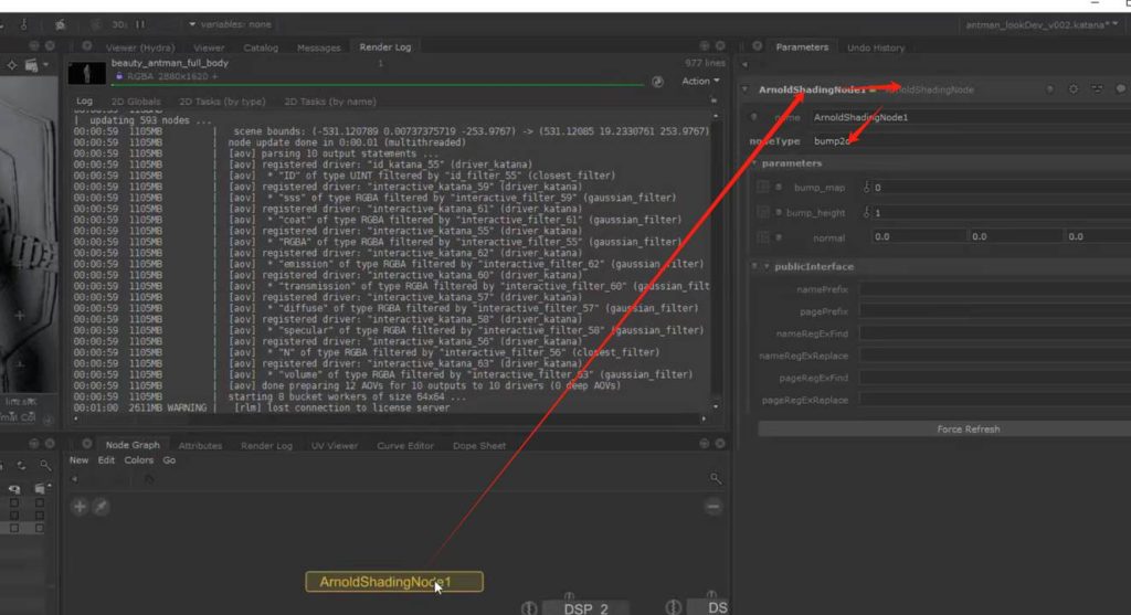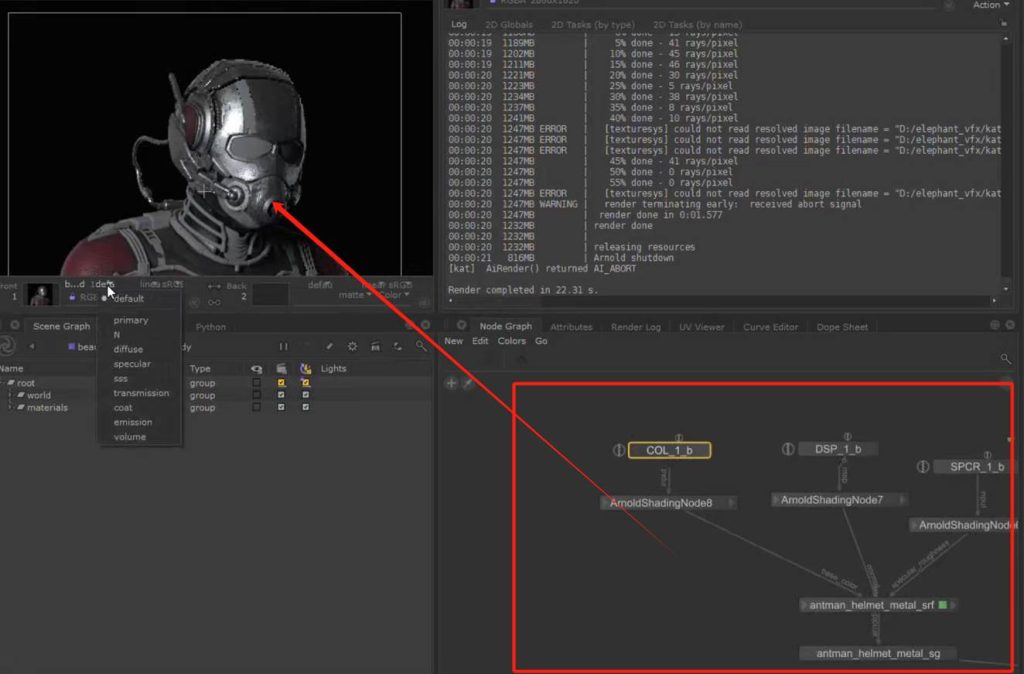 可以看到对于置换类的节点处理是需要在终端多添加置换终端的,而其他基于纹理上的处理可以都在surface 终端中处理,类似clarisse的处理模式: