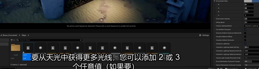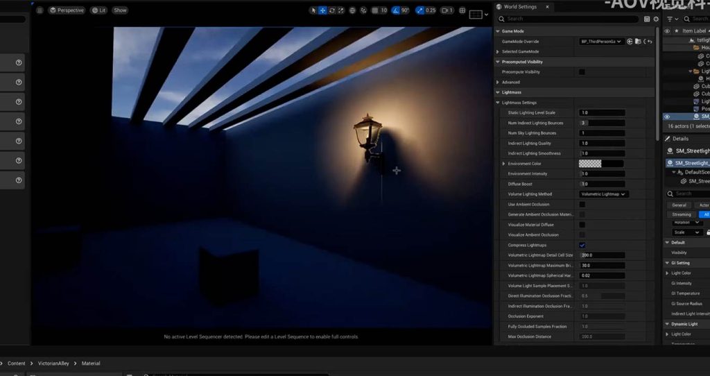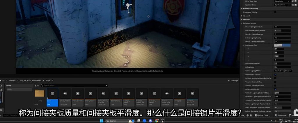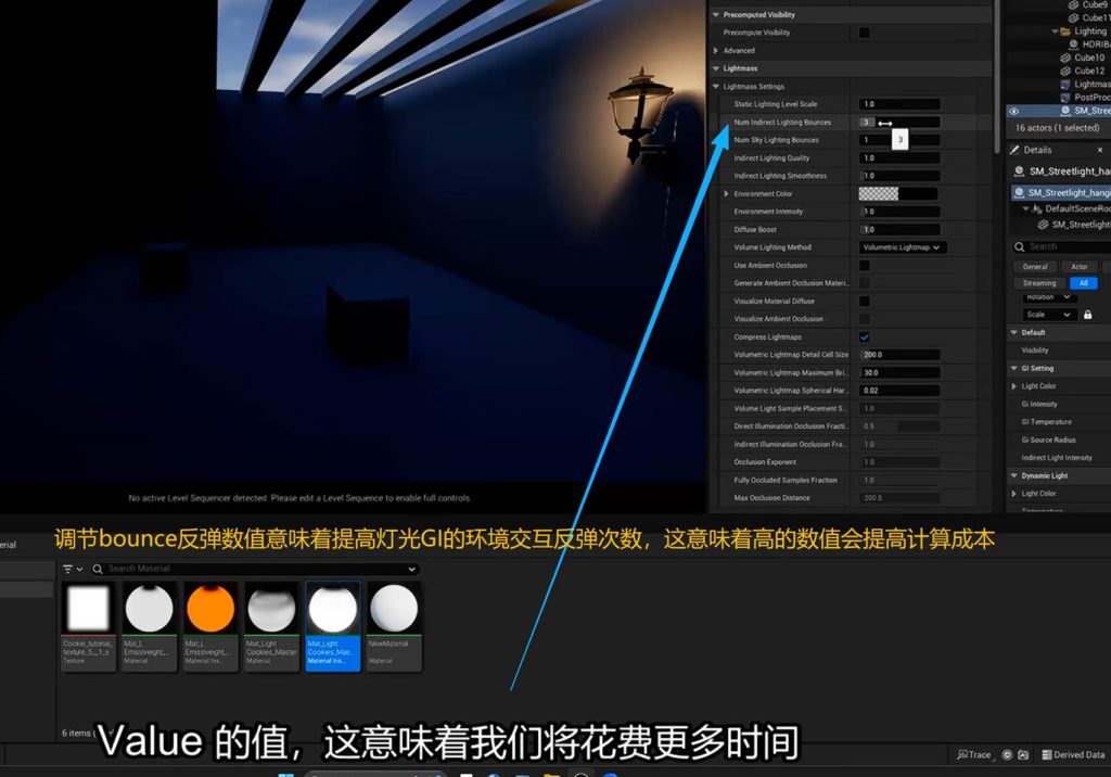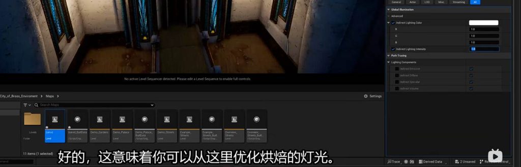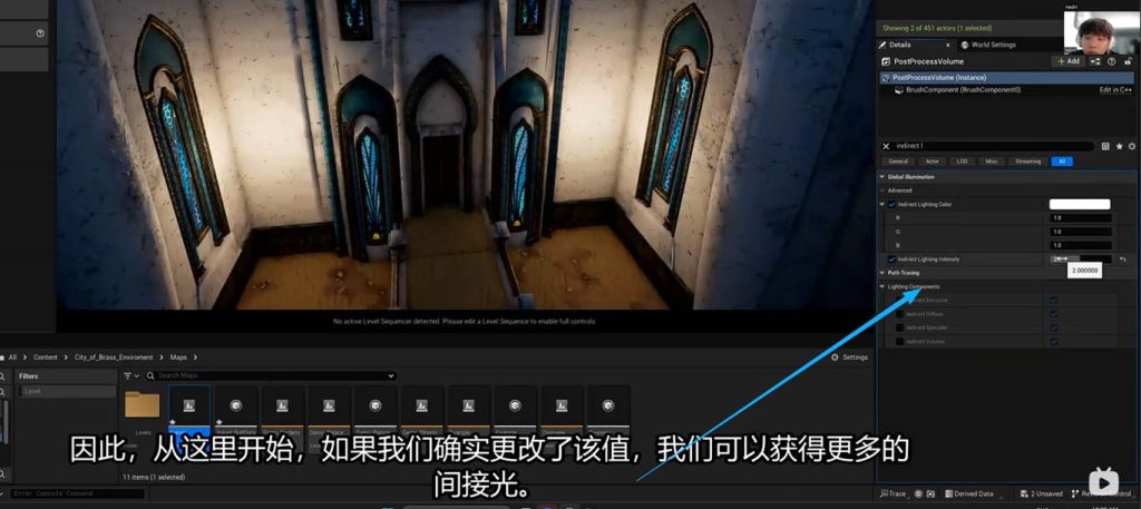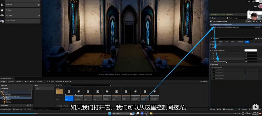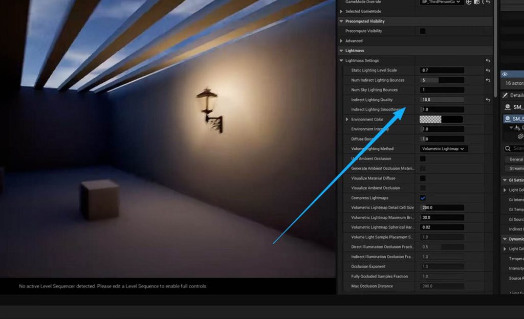 这意味着在后期盒子中调节间接光的亮度参数,可以不经过烘焙直接启动效果,这意味着我们可以在这个地方进一步优化GI(一号)的间接光烘焙的灯光贴图,也就是light mass。