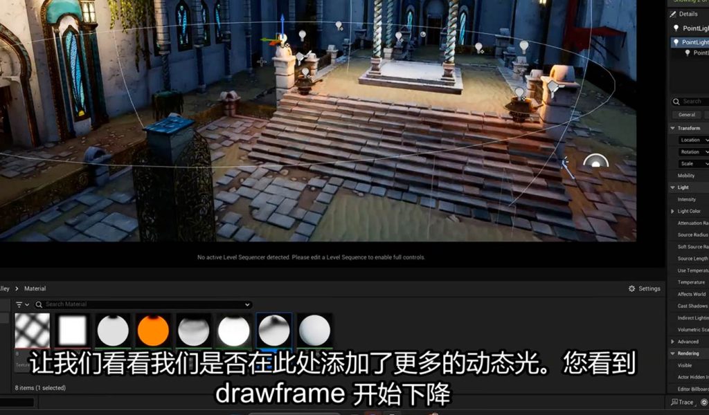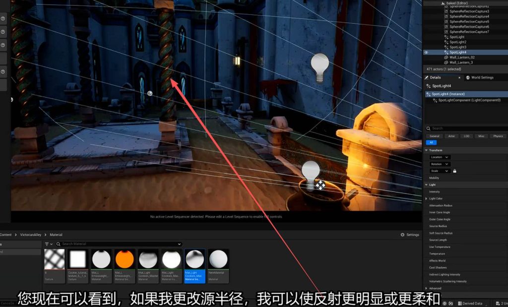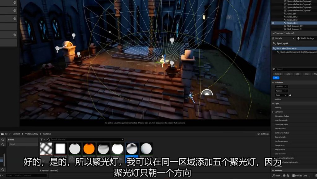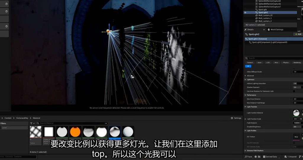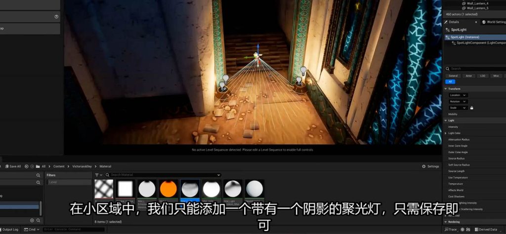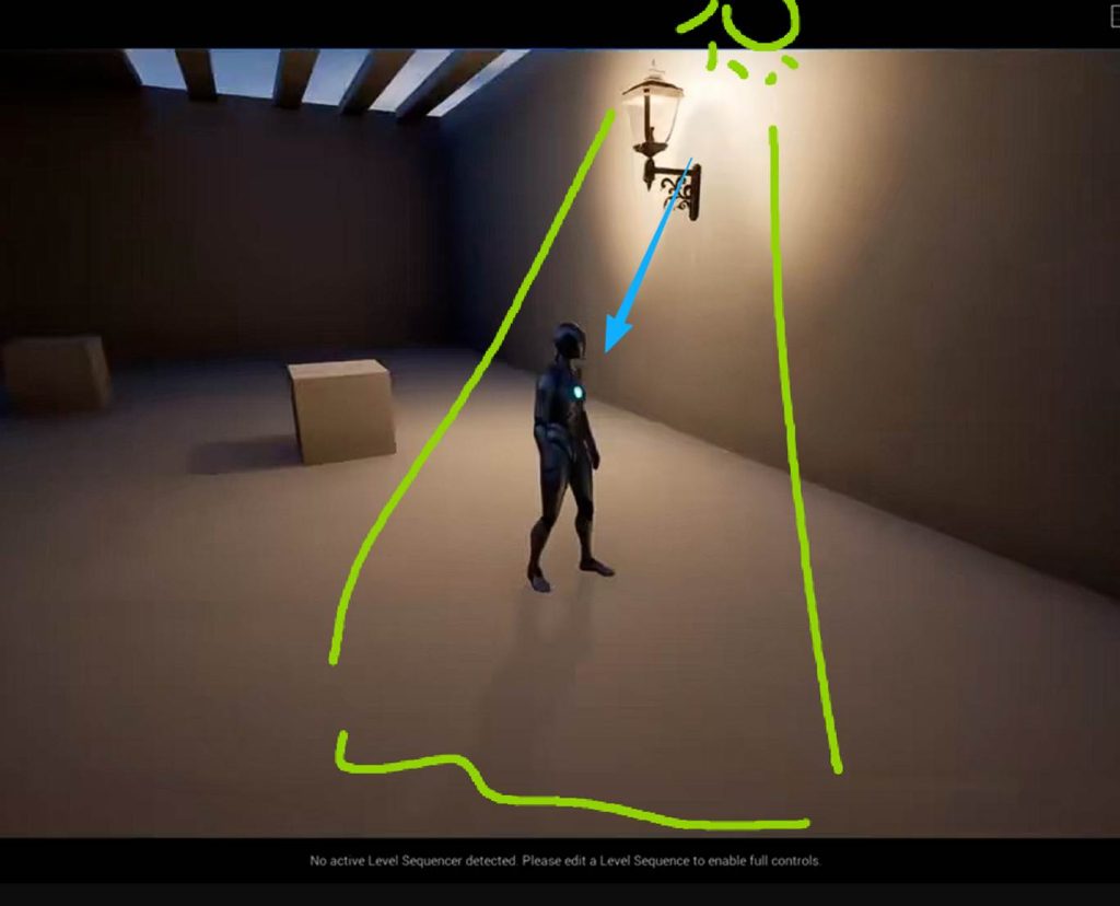 那么为什么不直接在动态点灯光上扩大灯源的大小呢?因为之前我们提到过,动态点灯的成本是很大的,而且项目要求中动态灯的重叠数量是有限制的,而动态聚光灯的距离可调,而且方向是单一的,开销比大范围的扩大动态点光 来的好: